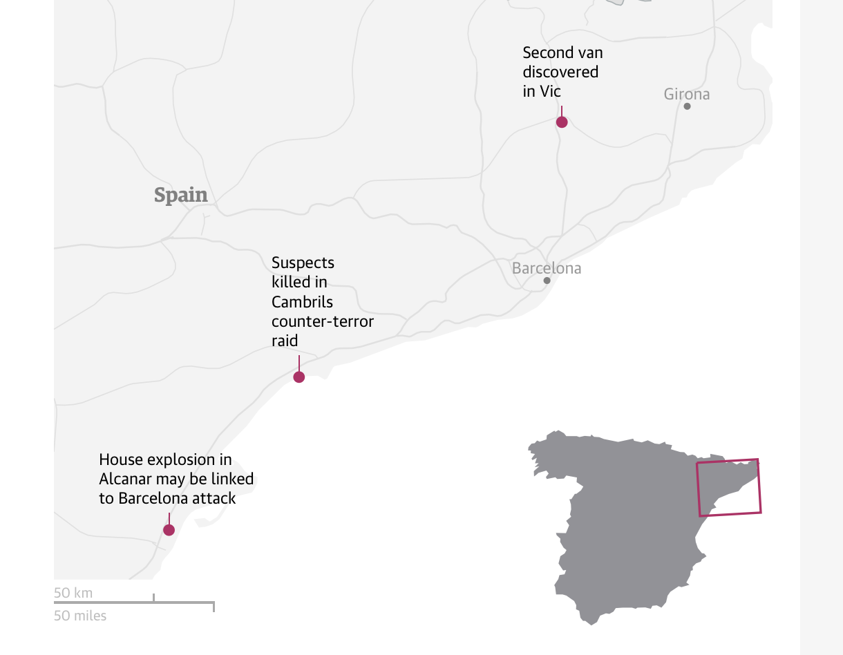 据《卫报》报道,海滨旅游胜地坎布里尔斯距离巴塞罗那约120千米。警方称坎布里尔斯的反恐行动与巴塞罗那的恐怖袭击相关。警方在随后的声明中称形势已经得到了控制。