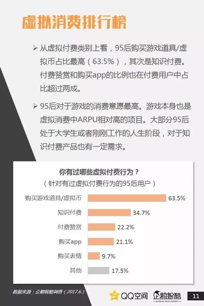 针对虚拟付费这一块,对于95后的年轻群体来说,是一件再正常不过的事情了,加强互联网支付的快速发展,线上消费的门槛不断降低,95后的付费人群比例相当的高。其中游戏类虚拟道具的消费占比高达63.5%,即使当下中国互联网的人口红利已经消失,但消费升级带来的市场红利还是可以支持游戏行业持续快速发展的。