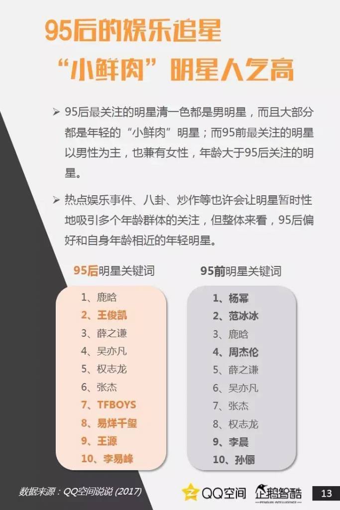 最后一个值得游戏行业关注的信息,就是95后人群的追星习惯,这一点对于游戏营销来说是很值得做标的参考的。《王者荣耀》会找鹿晗做代言人的原因很简单,就是年轻人喜欢,而这批年轻人,就是游戏行业的主流群体。