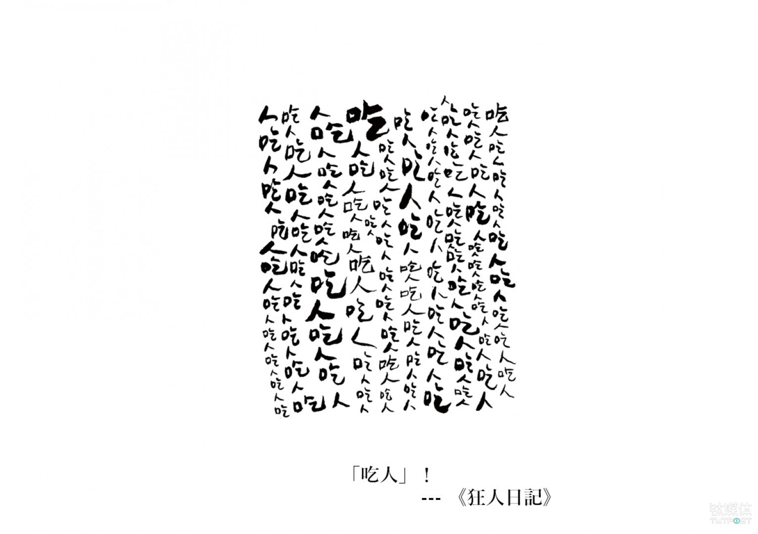 她画的第一幅是这个“吃人”,把图拿过来的时候,我其实吓了一跳,它远看就是一个二维码,越放大越吓人。你会发现这个作者很厉害,用这样的方式让《狂人日记》里面满篇都是吃人那种感觉都表现出来了。