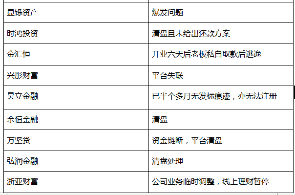 它们分别是:华东财富、佳联财富、甬佳贷、康意和、鼎融资本、京浙贷、联创财富、百聚财富、中山投资、融丰创投、译汇财富、甬利财富、振源财富、乔赢财富、庆协投资、昊华财富、保全财富、来鑫财富。