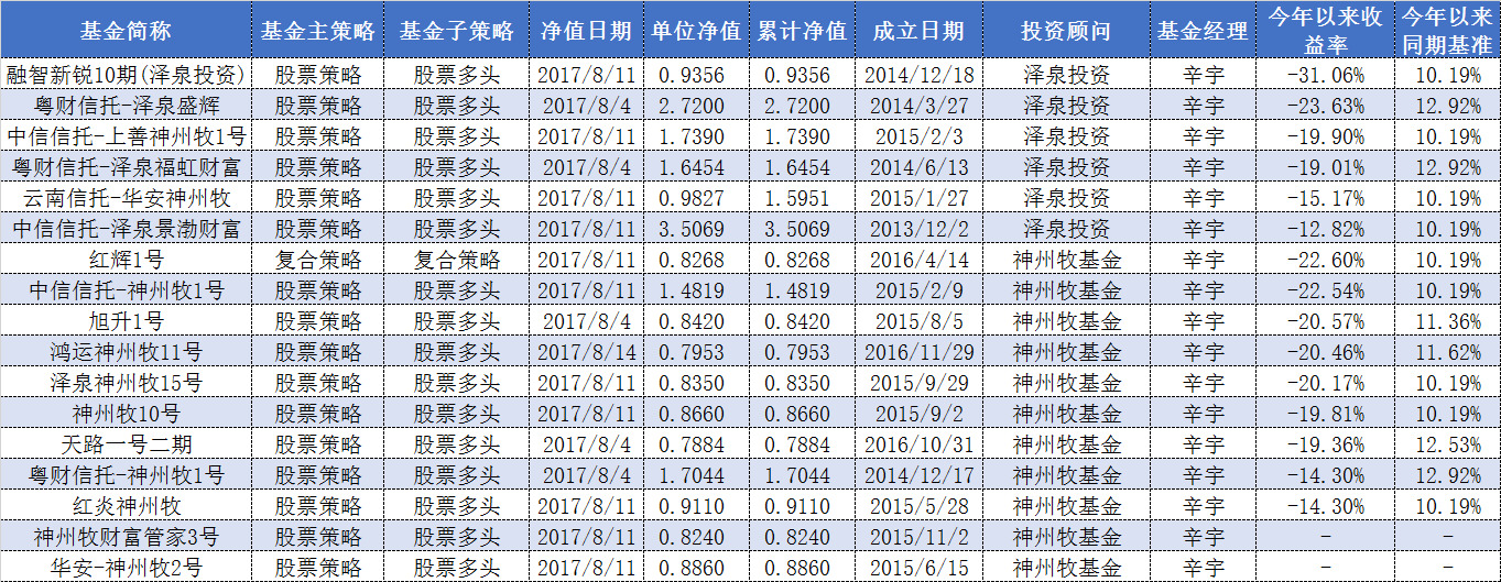私募排排网数据显示,目前辛宇旗下共有17只产品正在运行且净值近期有更新,其中15只产品更新了今年以来的收益率。这15只产品今年亏损均在12%以上,其中7只产品亏损超两成。最惨的“融智新锐10期(泽泉投资)”今年以来收益率为-31.06%。