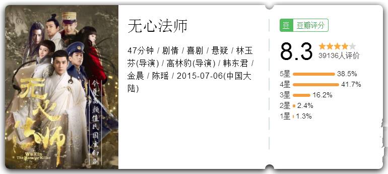 2015年7月6日,《无心法师》播出。在无大明星、无大IP、无大制作的条件下,以新奇罕见的题材、高质量的制作和演员在线的演技,博得了观众与市场的认可。至今,豆瓣评分还维持在8.3。
