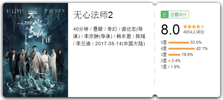 《无心法师2》的播出,则很有希望打破这个“魔咒”,有望改变“网剧二代”的现状。毕竟依照目前的豆瓣评分来看,两季差别不大,都维持在8.2左右。