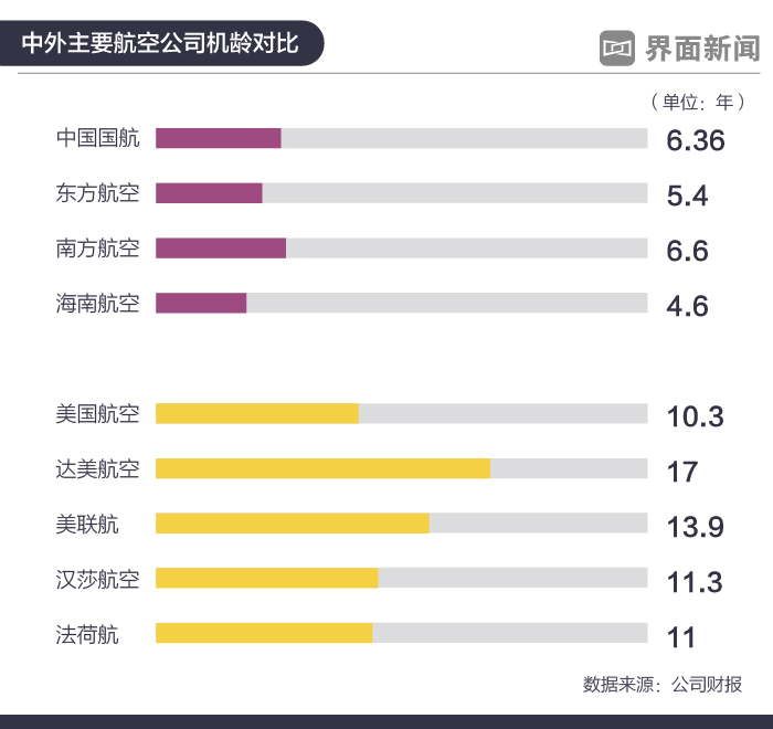 根据2016年的财报数据,美国三大航空公司-美国航空(American Airlines)、达美航空(Delta Airlines)以及美国联合航空(Unite Airlines)的平均机龄分别达到10.3年、17年以及13.9年,汉莎航空(Lufthansa Group)的平均机龄是11.3年,法荷航集团(Air France-KLM)的平均机龄是11年,几乎是中国三大航的两倍。