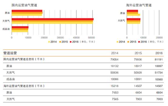 另外,中石油在国外也运营着相当长的一部分油气管道。2016年,中石油海外运营油气管道14507千米,其中原油管道6604千米,天然气管道7903千米。
