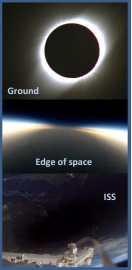 从地面,太空边缘和国际空间站观测日全食的对比图
