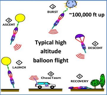HAB任务剖面:发放-上升-气球爆裂-降落伞减速下降-回收