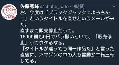 佐藤秀峰推特:我收到亚马逊要求把“问屌”改回去的邮件——“直到改回原名为止,都继续禁售”。替人卖15000本0元书,又突然玩停售、真是可笑。我回应“就算名字改了,那也是同一部作品”后,亚马逊的人也来回换了好几套说辞。