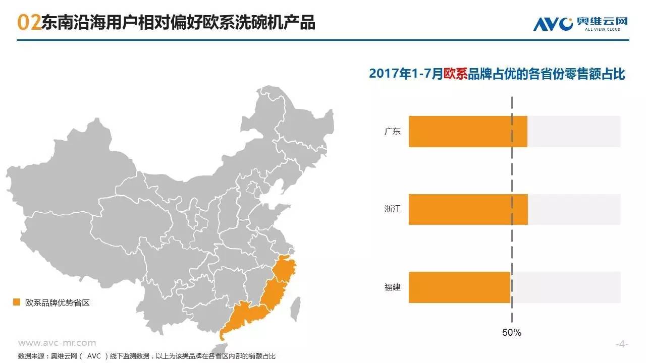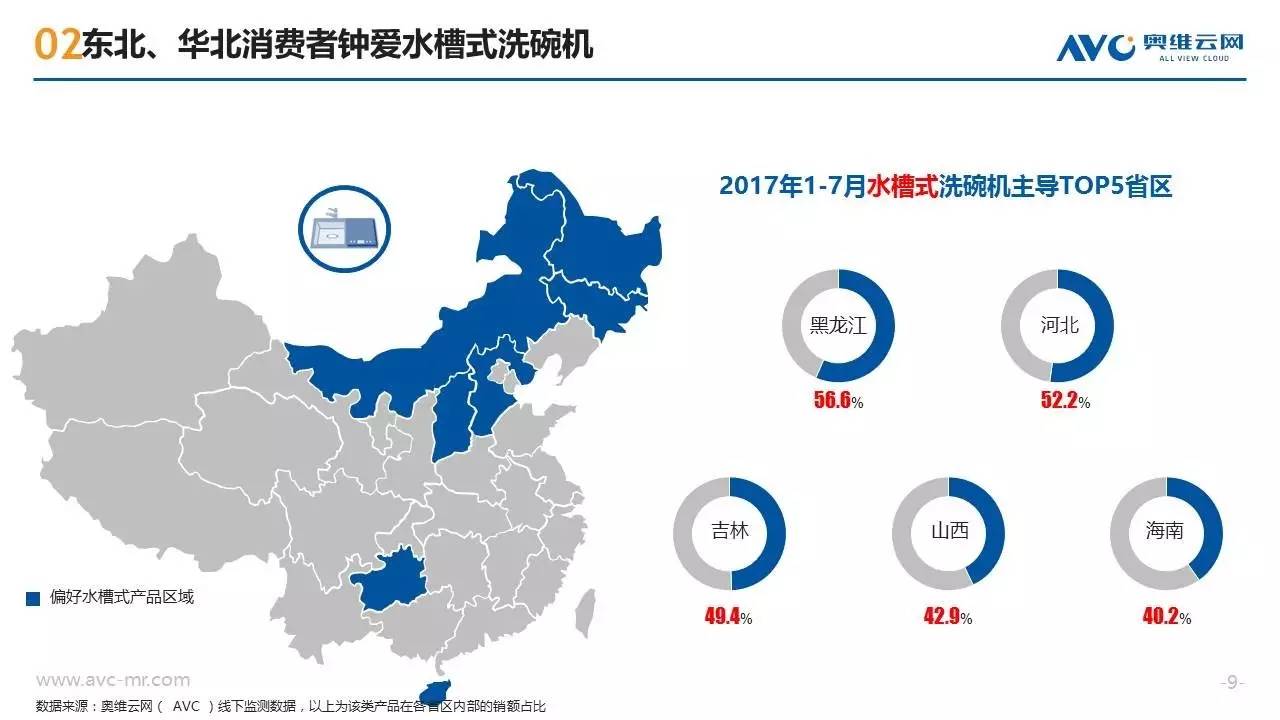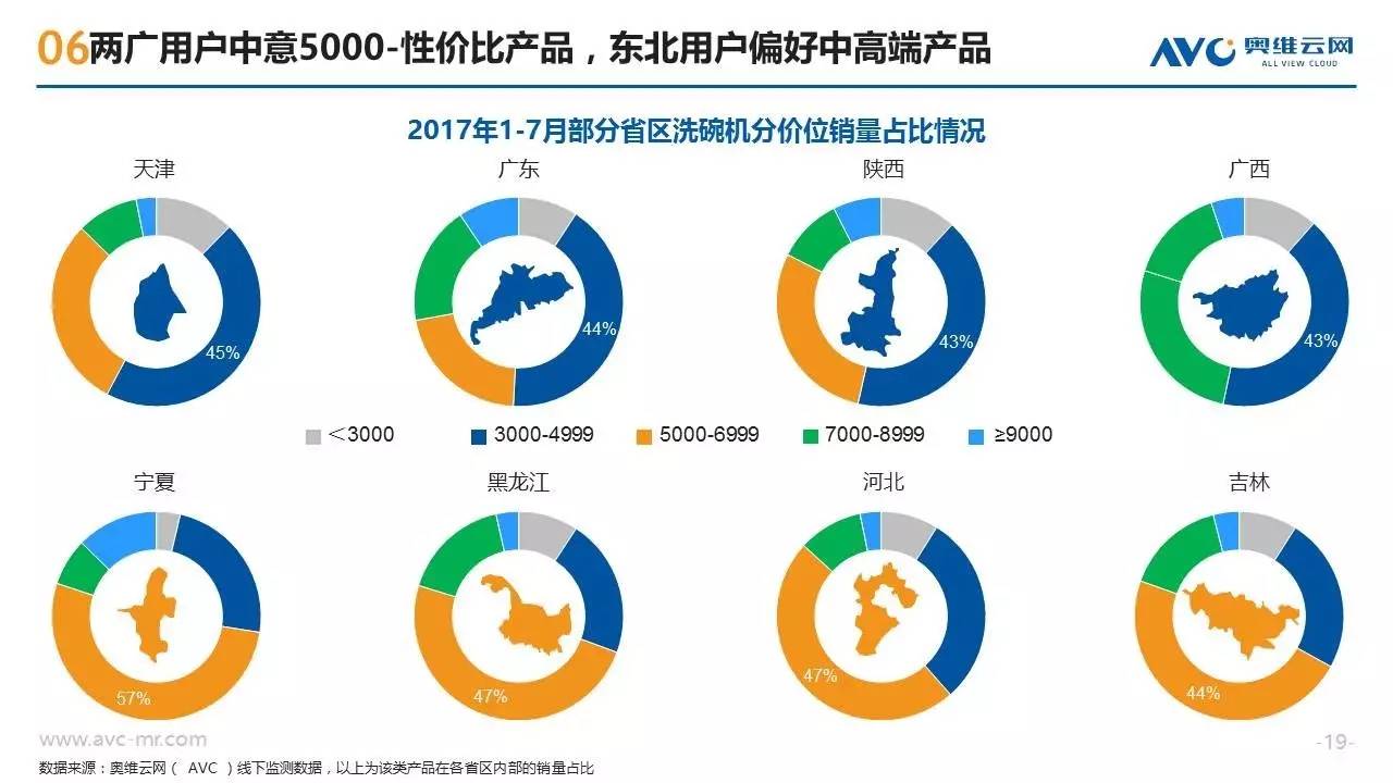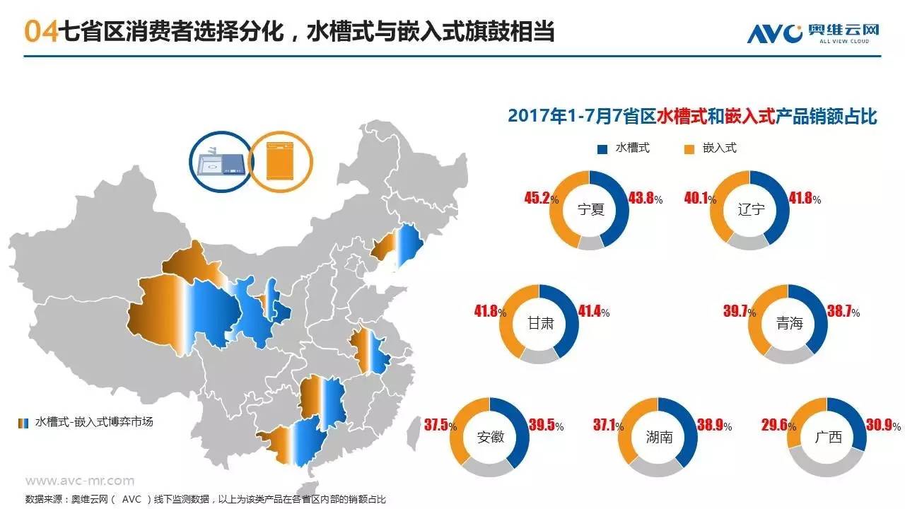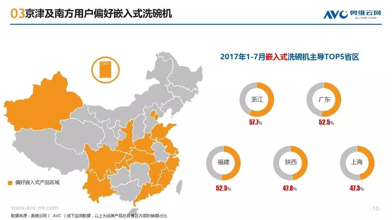 近年来随着消费需求的升级,洗碗机这种高端厨电产品开始越来越多的走入中国普通家庭,洗碗机也呈现出市场规模高速增长、产品技术持续迭代、竞争格局急剧变化的特征。作为一种新兴的“舶来”型家电,洗碗机在中国消费者心目中仍属于认知度较低的产品,不同地区的消费者在购买洗碗机时也往往呈现出强烈的地域性消费特征。奥维云网基于线下监测零售大数据,从品牌偏好、款式类型、性能指标三个方面,揭示不同地域的买家们对洗碗机产品的购买特征。
