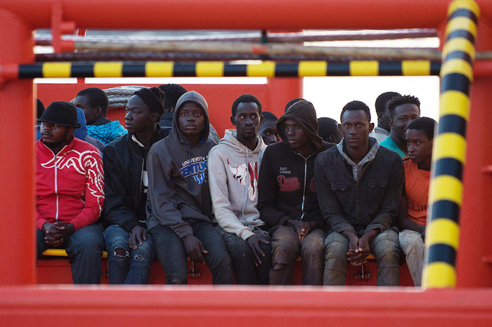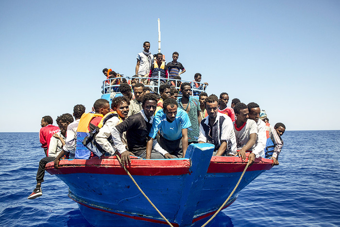 2. 2017年8月2日,距离利比亚海岸30英里的地中海,移民在救援船水瓶座上等待被救援,该救援船由非政府组织“地中海救援”和“无国界医生”运行。最新数据显示,利比亚移民到意人数突然急剧下降。利比亚领海北部公海一直是人道主义救援组织集结的地区。蛇头将偷渡者及难民用船运至公海区域后进行转运,或实际抛弃,致使该区域成为偷渡者及难民溺水死亡的重灾区。据国际移民组织统计,今年以来,已有近2400人葬身地中海。在意大利国内,难民及非法移民问题一触即发。意大利当局无奈借用军事力量和利比亚政府一起将偷渡者及“无证照”难民控制在从利比亚离岸的阶段,从而减少在意登陆的非法移民及难民人数,但也因此限制了人道主义救援的非政府及私人救援组织的救援行动。