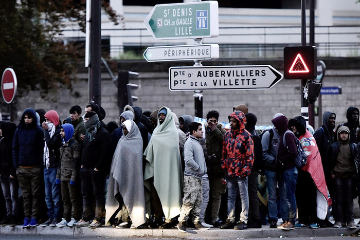 11. 2017年5月9日,巴黎。移民和难民们聚集在拉沙佩勒附近一个正在撤离期间的临时营地。近千名移民和难民将他们的帐篷搭建在了健康和安全环境恶劣的交通车道之间达数周之久。法国国内对于难民态度并非完全接受,设施的承担能力、经费的负担以及恐怖分子的潜入危机都是他们担忧的原因。