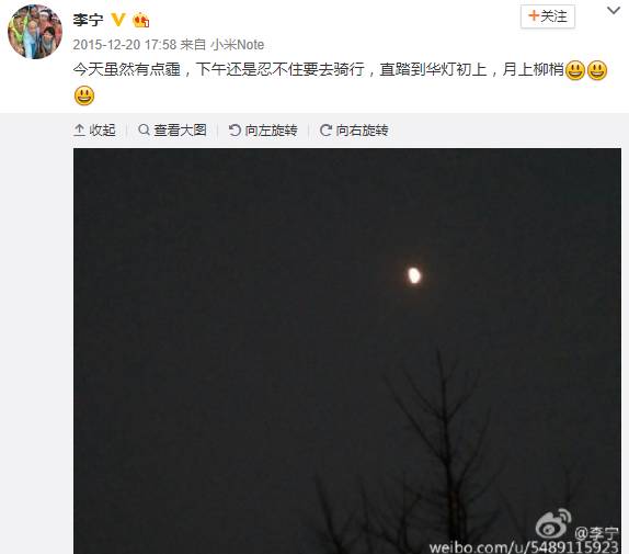 2015年12月20日,李宁在微博上说:“今天虽然有点霾,下午还是忍不住要去骑行,直踏到华灯初上,月上柳梢。”并配着一副夜色朦胧的图片。图片中他扶着自行车,在雾霾中前进。