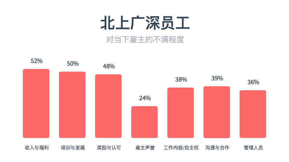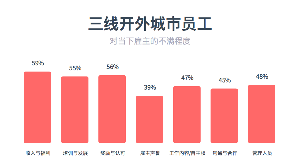 我们发现,来自港澳台及海外的员工除了雇主声誉以外在其他6个方面的不满意程度都是最高的,其中在收入与福利、培训及发展、奖励与认可、沟通合作上不满意率比其他城市的员工均高出10%以上。