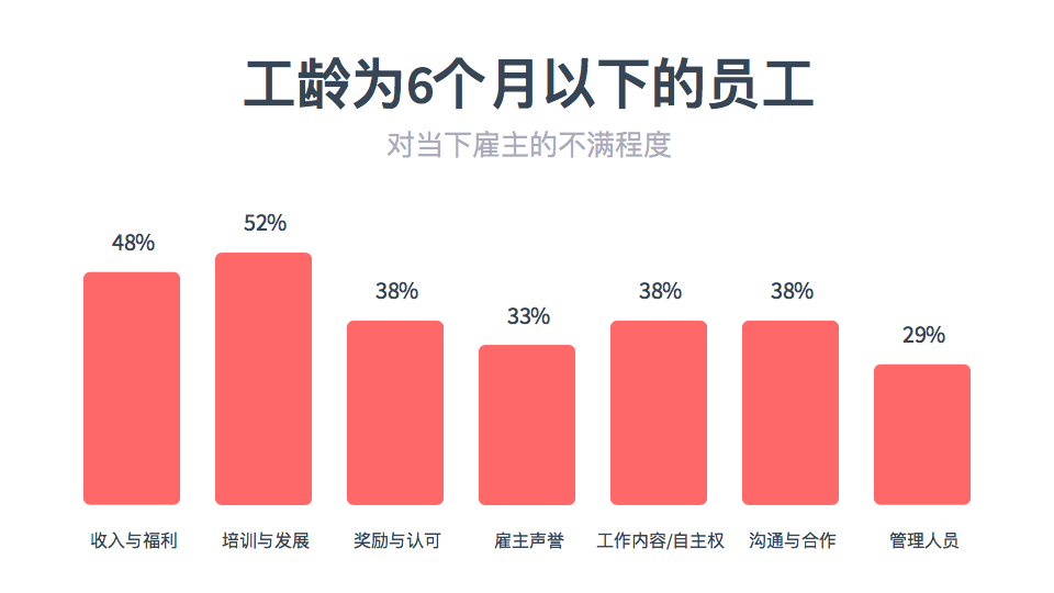 我们认为,工作满6个月会是员工对公司认知改变的重要时间点。调研结果显示,工作未满6个月的员工在雇主的各个方面满意度都保持在较高水平,而在工作6个月至1年的员工之中,他们对培训及职业发展、奖励与认可和管理人员的不满迅速上升。