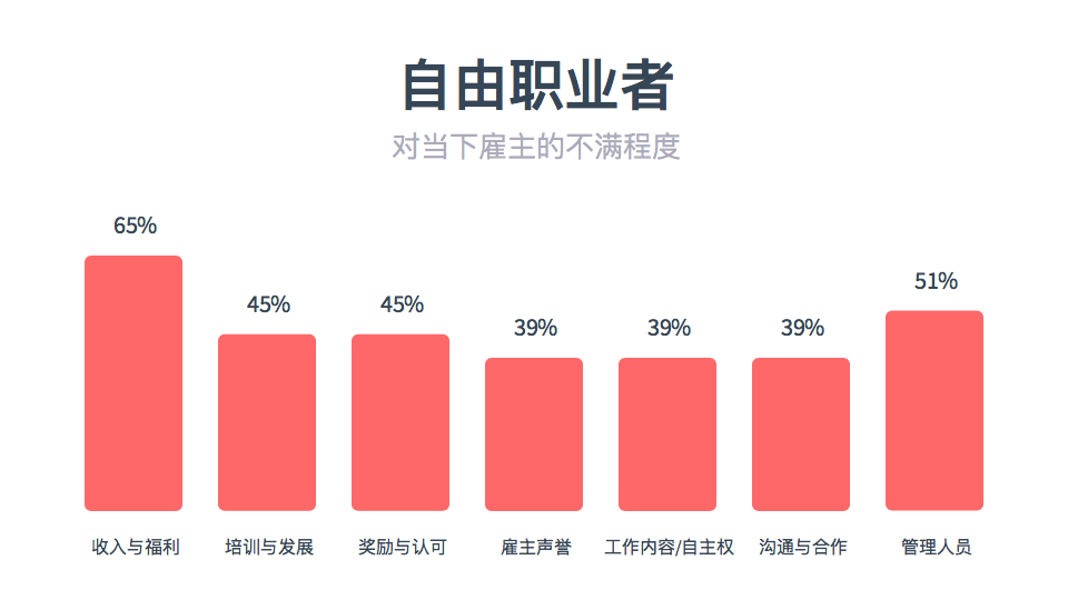 另外一个发现是,不隶属于任何机构的自由职业者们尽管对收入和福利最不满,但他们对职业发展、奖励认可、工作内容与自主权和沟通合作的满意度较高。职业咨询机构MBO Partners的《2017年美国自由职业者报告》指出,人们的工作动机在近年来发生了从经济到心理情感需求的转变,这反映在零工经济和自由职业的强力发展中。调研发现,虽然自由职业者担心没有稳定的收入、退休计划和工作机会,但工作的自主灵活性给他们带来的好处远远大于独自工作的困难。