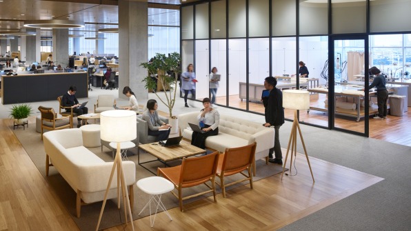 迅销公司创始人柳井正希望员工在办公室里有在家一样的放松感,因此采用了居家风的设计。办公桌旁摆放着安乐椅、沙发和自带天然属性的木桌。这样风格体现了硅谷工作理念:工作、生活不分家,随时随地无压力转换——不想在伏案而作?带着你的电脑去旁边的懒人沙发上躺一会儿吧!