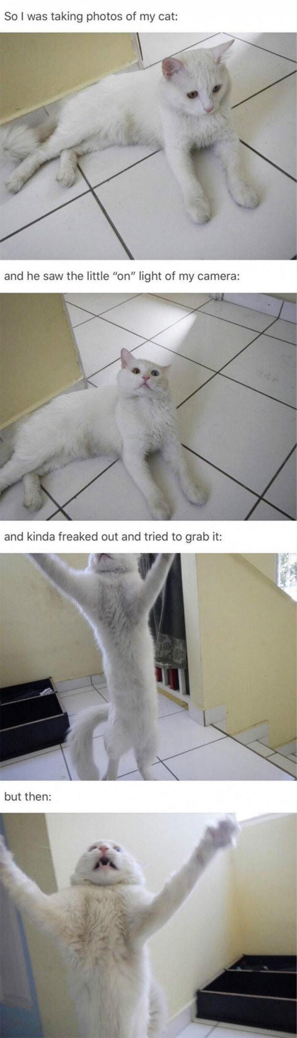 我正在给我家的猫猫拍照,当闪光灯亮起的时候,他完全被吓到了,然后想要抓住这个潜在的威胁,然后...