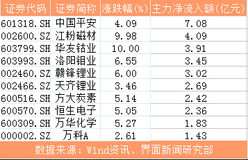 中国平安(601318.SH)作为金融股中一员“大将”,以7.08亿元主力净流入强势霸占个股第一,半年报显示,公司上半年实现净利润434.27亿元,同比增长6.5%,美银美林、摩根士丹利分别给予其“买入”、“增持”评级。有色金属个股表现最为活跃,主力净流入十大个股中占据6个席位,江粉磁材(002600.SZ)、华友钴业(603799.SH)分别净流入4.09亿元、3.91亿元,实现封板涨停;洛阳钼业(603993.SH)、赣锋锂业(002460.SZ)、天齐锂业(002466.SZ)、方大炭素(600516.SH)分别实现净流入3.45亿元、3.02亿元、2.69亿元、2.42亿元。