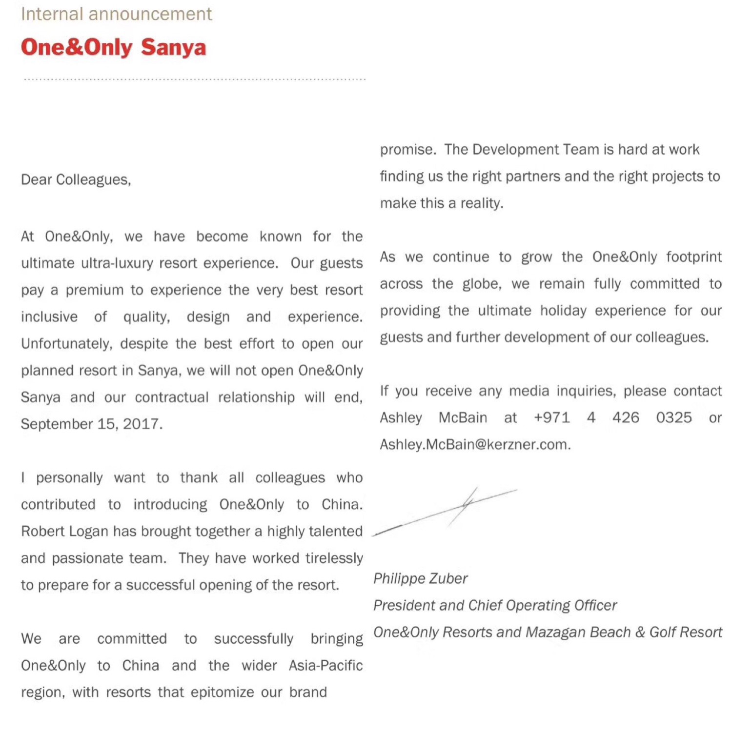 “亲爱的同事们,我们One&Only度假酒店以极致的超豪华度假体验著称,我们的客人花大价钱来体验最高级的酒店品质、设计和体验。不幸的是,即便花了最大的精力来筹备三亚One&Only度假酒店,我们仍无法促成其开业,同时我们将于2017年9月15日终止合同及合作关系。感谢所有同事为把One&Only带入中国所做的贡献……”