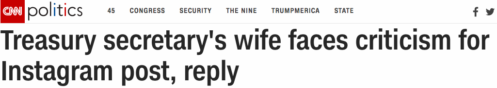 【美财长夫人网上炫富被围攻】美国财政部长姆努钦的妻子林顿(Louise Linton)周一由于在Instagram上发帖炫富而遭到抨击。