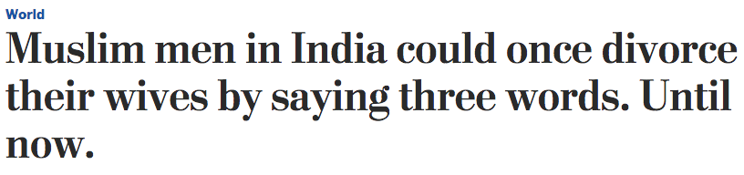 【印度穆斯林男子说三遍这个词就可以离婚?现在不行了】数百年来,印度的穆斯林男子想要和妻子离婚,只要重复三次阿拉伯语的“talaq”(意味“离婚”)就可以了。但周二,印度最高法院宣布此举不符合宪法。