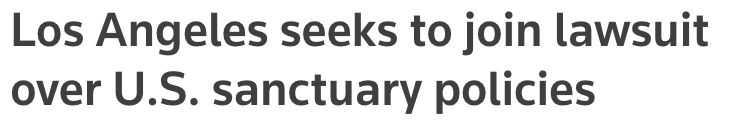 【洛杉矶要和旧金山一起起诉美国司法部】法庭文件显示,加利福尼亚州的洛杉矶市周二试图加入一起针对美国司法部的诉讼,反对执法部门给予所谓“庇护城市”的一些联邦限制。