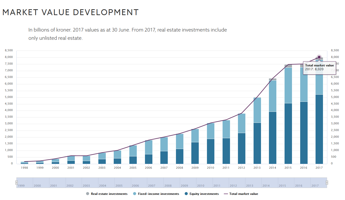 截止2017年上半年,挪威主权财富基金市值为8.02万亿克朗,约1.01万亿美元,其中超过六成用于投资股票,三成左右投资固定收益资产,另有2.5%投资非上市房地产。