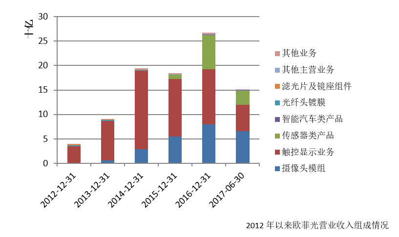 实际上,5年前,欧菲光的摄像头模组业务还并无一分钱营业收入;2013年,该项业务第一次出现在公司的营收结构中,达到5.88亿元,2014年-2016年连续三年实现增长,营收规模分别达到28.69亿元、54.96亿元和79.40亿元;今年上半年,该项业务更是进一步实现同比翻倍增长,正式宣告欧菲光完成了向摄像头模组业务的转型。