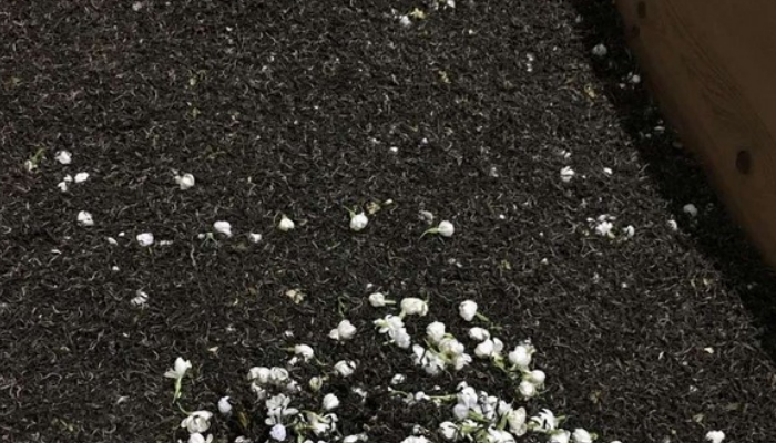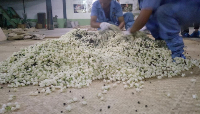 伺花:鲜花进厂后要选择阴凉洁净的地方及时薄摊散热。有经验的制茶师傅,将手伸进花堆就能知道何时需要将花再翻动。