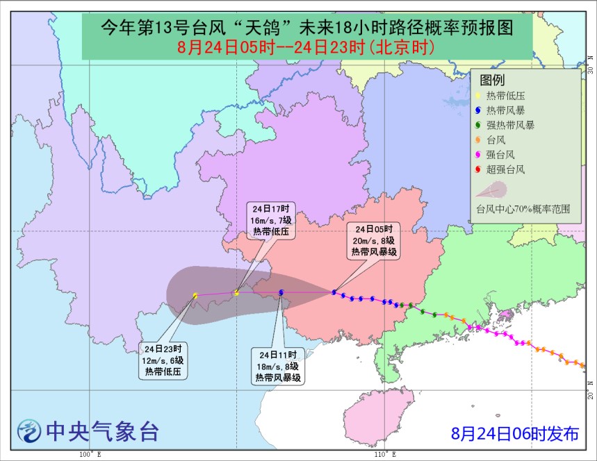 24 日 08 时,“天鸽”中心位于广西南宁市境内,最大风力18米/秒(约65公里/时),中心气压994 hPa。