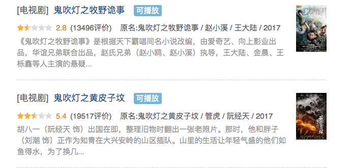 与此同时,形成鲜明对照的是一些大IP的失手:《鬼吹灯之牧野诡事》虽用了王大陆这样路人缘不错的新晋小生,但是他也挽救不了制作和剧情的尴尬;导演管虎执导的《鬼吹灯之黄皮子坟》轰轰烈烈开场,但题材的重复和故事的不明所以让该剧沦为这一季的平庸之作。