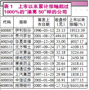2017年的A股市场,“漂亮50”(以上证50成分股为标的)很漂亮,贵州茅台身为“漂亮50”中的一员,截至8月23日,今年以来股价累计上涨50.08%,相比中国平安(累计上涨58.06%)、招商银行(累计上涨55.81%)稍显逊色。将时间的横轴延长,统计“漂亮50”们上市以来的表现,贵州茅台9781.4%的累计涨幅并未登顶,伊利股份目前的股价虽然只有23.15元,但上市以来累计涨幅却达到了19313.39%。当然,你可以说伊利股份(1996年3月12日上市)的上市时间比贵州茅台(2001年8月27日上市)早,如果简单以上市年份统计年涨幅平均值,伊利股份上市后约21年,每年平均上涨约919.68%,贵州茅台上市后约16年,每年平均上涨约611.34%,仍是伊利股份略胜一筹。但这只是一个简单的平均数。我们观察“漂亮50”们自上市以来历年真实的股价表现,贵州茅台17个自然年(2001年、2017年非完整年份)中,14个年份股价以上涨收官,占比高达82.35%,当之无愧地成为了以年为单位股价上涨概率最高的公司。位居其后的是中国中车,上市约10年,8年股价年内上涨,占比80%。目前,全部标的股中,仅有上述两家公司以年为单位股价上涨概率超过了80%。而从累计涨幅看,中国中车就平凡得多了,上市以来股价共上涨了235.42%。