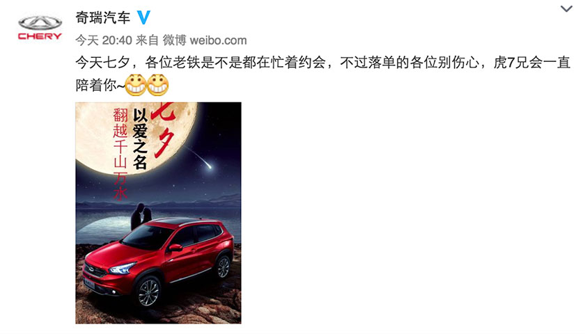 这里首先表扬一下吉利博越,图片不low颜色也不复杂,再加上“天涯地角有穷时,只有相思无尽处”诗句的妙用,让人瞬间进入情景,千纸鹤、信纸,代表了满满的思念,那就是说明这俩人也不在一起过七夕啊,这么想想瞬间开心了。