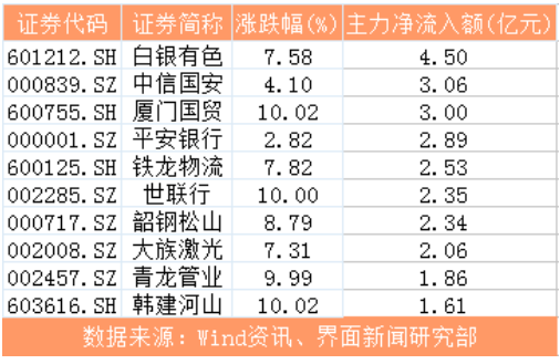 虽然有色金属多只个股回调,但作为行业龙头的白银有色(601212.SH)早盘时直线涨停,虽然随后涨幅回落,但仍有4.50亿元主力资金净流入。中信国安(000839.SZ)实现主力资金净流入3.06亿元,公司昨日发布半年报显示,上半年实现营业收入23.02亿元,同比增长37.37%;实现净利润2.41亿元,同比增长41.89%。此外,雄安新区概念股青龙管业(002457.SZ)、韩建河山(603616.SH)分别实现1.86亿元、1.61亿元主力净流入额,尾盘均以涨停报收。