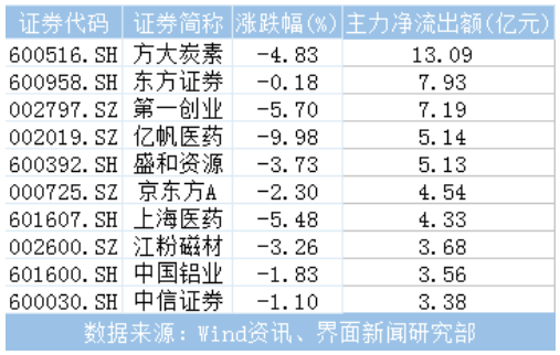 今日,方大炭素(600516.SH)、盛和资源(600392.SH)、江粉磁材(002600.SZ)、中国铝业(601600.SH)分别遭遇主力净流出13.09亿元、5.13亿元、3.68亿元、3.56亿元。券商股亦遭遇主力资金抛售,东方证券(600958.SH)、第一创业(002797.SZ)主力净流出额分别为7.93亿元、7.19亿元。昨日受主力热捧的中信证券(600030.SH)主力净流出额为3.38亿元。
