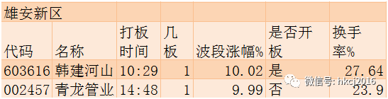 上涨情况:雄安新区板块尾盘突袭,青龙管业和韩建山河两只个股强势涨停。