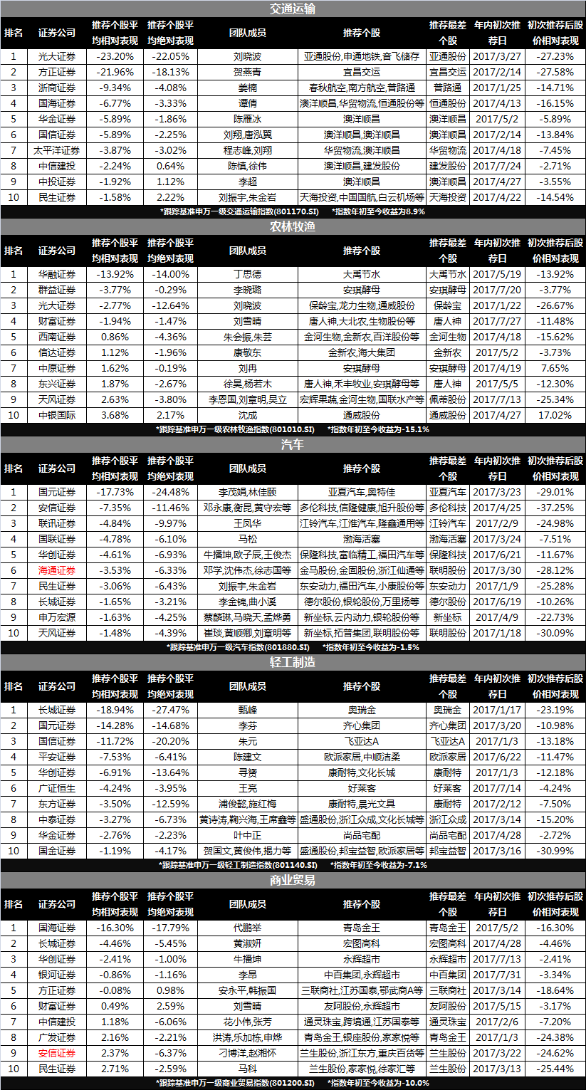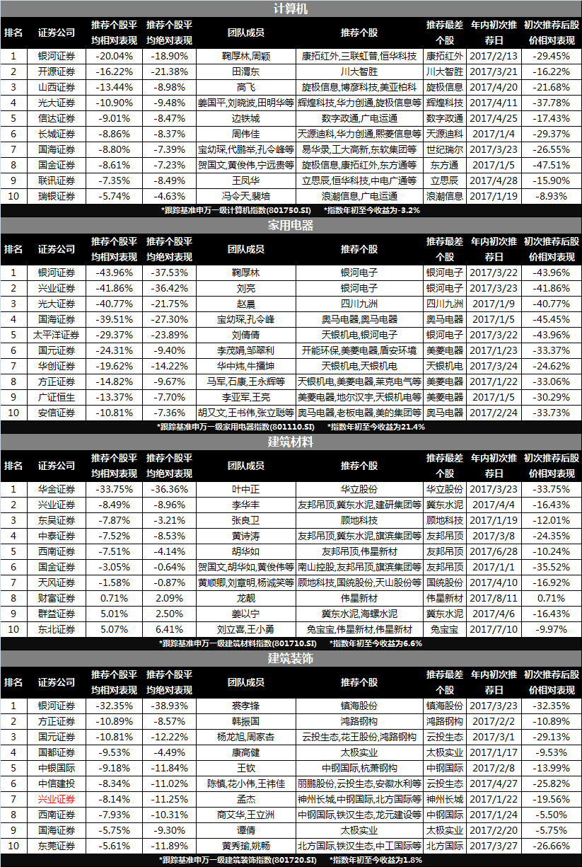 排在榜单第三位的是安信证券,今年以来买入评级研报涉及申万一级行业26个,今年初至8月20日整体绝对收益为-0.35%,相对收益为0.69%。以相对收益衡量,表现最不好的行业为家用电器,其相对收益为-10.81%、绝对收益为-7.36%。胡又文、王书伟、张立聪等为该行业团队成员,推荐最差个股为奥马电器(002668.SZ),该股最早推荐时点为2月24日。