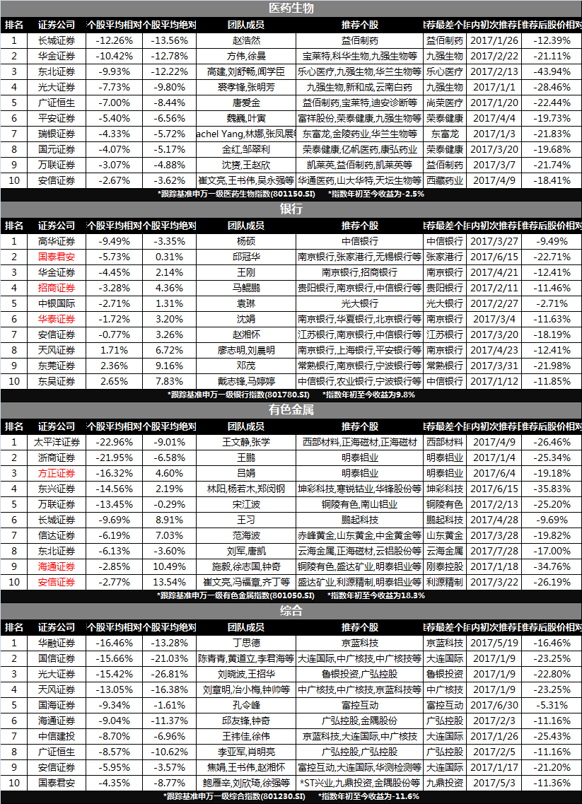 界面新闻以每一份研报荐股后的最新可买入时点价格(处于正常流通、非连续涨停的股票,荐股日收盘价格即为最新可买入时点价格,对于假期发布的研报,最新可买入时点价格近似为假期前收盘价)为起点,计算个股至8月20日的涨跌幅,即个股绝对表现;同时计算相同时间区间对应的个股所属申万一级行业指数涨跌幅,两者之差即个股相对表现。相对表现剔除了行业整体景气度对业绩判断的影响,更能体现各研究所对行业内个股的精选能力。随后,界面新闻对各研究所年内所有推荐股票的个股相对表现取均值,并分行业统计出最不靠谱的券商研究所排行。并对14届新财富上榜研究所进行标红。