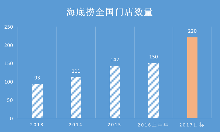 今年4月,张勇对外表示,海底捞今年可能新开80家门店,其中10家新店将开在海外。70家国内门店并不是个小数目:截止到2016年上半年,海底捞全国门店总数也才150家。而对比起来,2014、2015年海底捞新开的门店数量仅为18家和31家。张勇同时预计,海底捞今年营收将增长30%以上,达到100亿人民币。