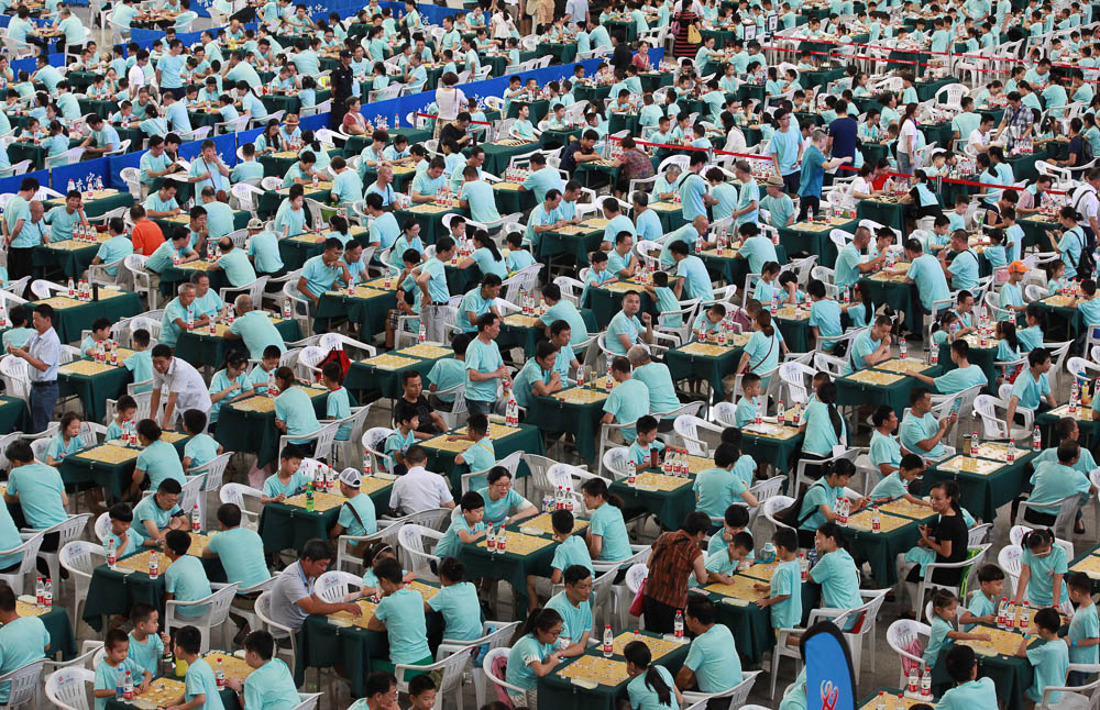 2017年8月8日,是第九个全国“全民健身日”。全国棋牌万人同赛主会场活动在宁波举行,吸引了近2000名宁波棋牌爱好者参与。本次活动共设1个主会场和全国21个省市的30多个分会场。图为选手们在宁波国际会展中心进行棋牌比赛。