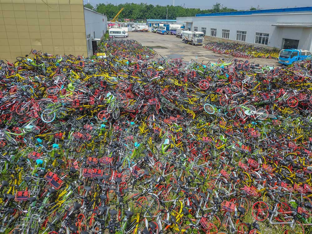 2017年8月15日,安徽省合肥市清溪路与潜山路交口,一片停车场里,数千辆各类共享单车堆在一起,形成了两座“车山”。停车场看门师傅介绍,这些共享单车都是被城管部门暂扣的,几乎每个星期,都会有辖区城管开着货车,将查扣的共享单车运到停保场里。