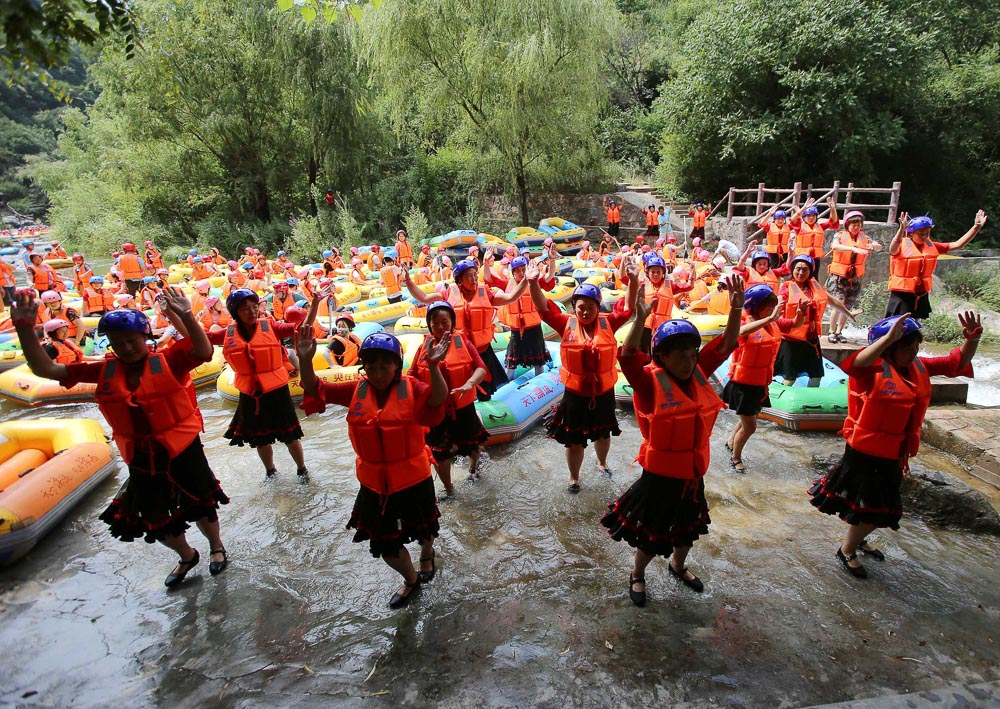 2017年8月16日,河南卢氏豫西大峡谷漂流游客有增无减,漂流河道堵成长龙,大妈们把皮筏艇拉到浅滩,开始激情四射的水中跳起广场舞,还有人现场放音乐。