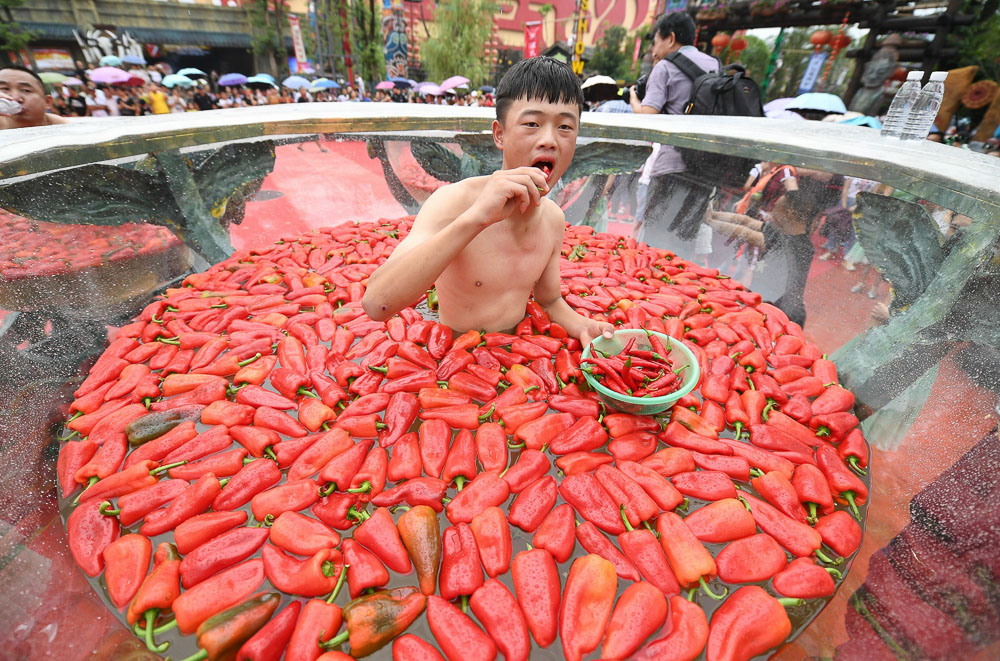 8月12日,湖南宁乡炭河古城举办首届“辣王”争霸赛,选手蹲坐在放满辣椒的水缸中挑战吃辣椒。最终,来自湖南娄底的苏先生在60秒时间内连吞15个生辣椒夺冠。