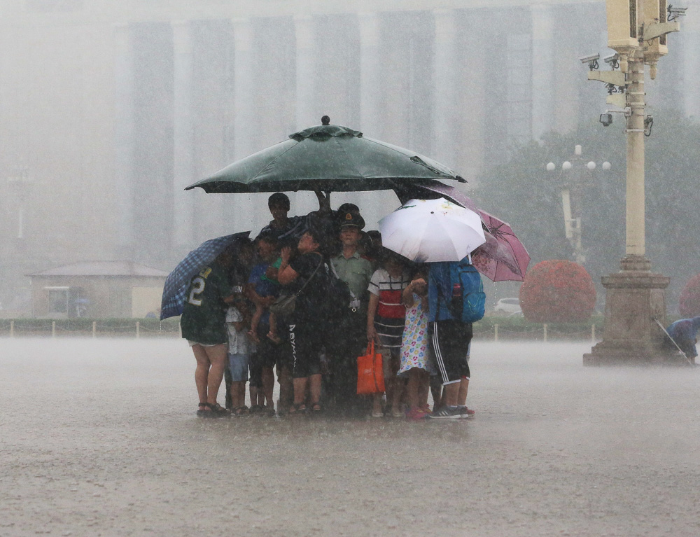 2017年8月18日,游客冒雨游览天安门广场。当天北京遭遇暴雨天气,北京气象台拉响暴雨蓝色预警信号,提醒市民外出做好防范措施。