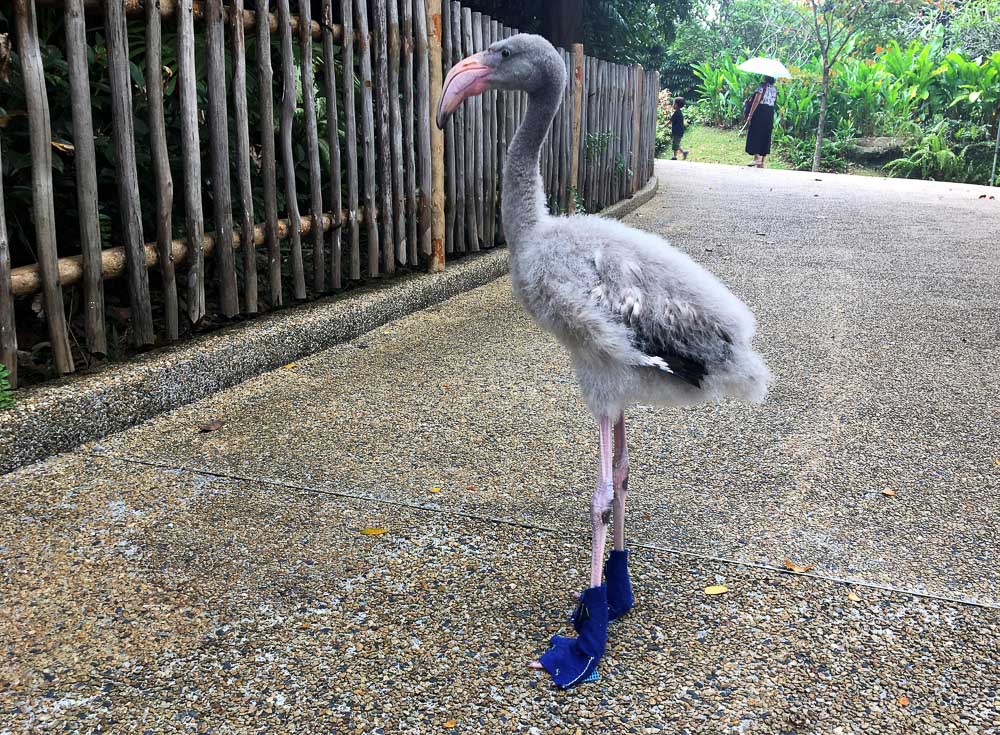 2017年8月17日,新加坡,一只大红鹳幼鸟脚上穿着鞋避免被灼热的地面烫伤。