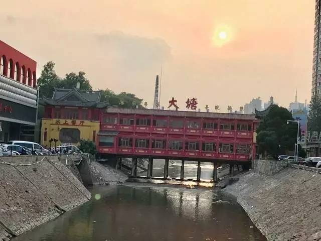 根据微博评论的留言,我找到了公园外的大塘水上餐厅。这是一幢由左右两座黄色阁楼和红色双层长廊组成的横跨金水河两岸的外墙有些剥落的仿古建筑。在听广播的老大爷的指点下,我像《桃花源记》里描述的那样穿过餐厅左侧一条仅能容纳两人贴身而过的狭窄过道,最终顺利找到了网红一条街。