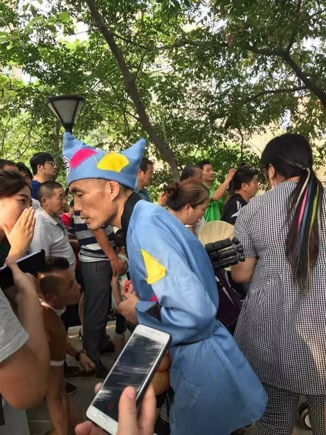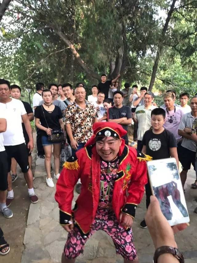 电王和化肥有时也会到红毛团队里跳舞,除了二强团队,剩余三个团队都可以彼此串场。电王本人清瘦,化肥则圆头圆脑,这天下午,两人分别穿着一件浅蓝色的济公服和一件鲜红的绣花马褂出场。作为尬舞团里最知名的网红之一,电王一出现就被现场三家媒体包围起来,面对镜头,电王面不改色自称全球有八亿粉丝。