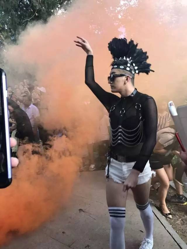 双枪老大妈团队里经常有人男扮女装来跳舞。伴随着欢呼声,头戴羽冠身穿黑色女式内衣和白色短裤的高个男青年在橘色烟雾中出场。男青年的舞蹈动作很多取自钢管舞,由于没有钢管,男青年贴近双枪老大妈旋转下蹲做出各种亲密动作。双枪老大妈则假装出恼怒的神情,引起周围人的哄堂大笑。