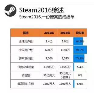 得益于Steam平台的发展,给众多端游带来了意想不到的宣传效果,因此端游数量有了明显的提升,大部分端游的收入增长主要也来自于Steam平台。截止2016年,Steam全球用户数已经达到2亿人,增长率达到64%;同时在线人数峰值也是到达了1390万人,同比增长6.9%。目前平台的游戏数量大幅增长,累计游戏的数量已经达到16000+款。